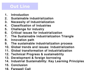 This document provides an outline and overview of a lecture on industrialization and sustainability. It discusses key topics such as the necessity of industrialization, challenges for industry, critical issues like population growth and resource constraints, the sustainable industrialization process, and balancing technical progress with environmental sustainability. Global trends in industrialization are also examined, including the transformation to more innovative and localized production models.