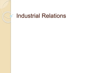 Industrial relations involves the relationship between employees and management, including interactions mediated by unions, employers, and the government. It encompasses collective bargaining, dispute resolution, worker participation, and regulation of unfair labor practices. Strong industrial relations are important for sustained production and worker satisfaction through high morale and reduced conflict. Trade unions also play an important role by representing workers, negotiating on their behalf, and providing economic security. Collective bargaining is a key process that establishes employment conditions through joint negotiation between company and union representatives.