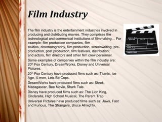 The document defines and provides examples of the major media industry sectors, including: the film industry (e.g. 20th Century Fox, DreamWorks, Disney), radio industry (e.g. rock, pop, and soft music stations), television industry (e.g. providers like Sky, BT, and Freeview), print industry (e.g. magazines, newspapers, labels), advertising/marketing industry, press/news media, and games design industry (e.g. for consoles and mobile devices). It describes some of the key aspects, companies, and products within each sector.