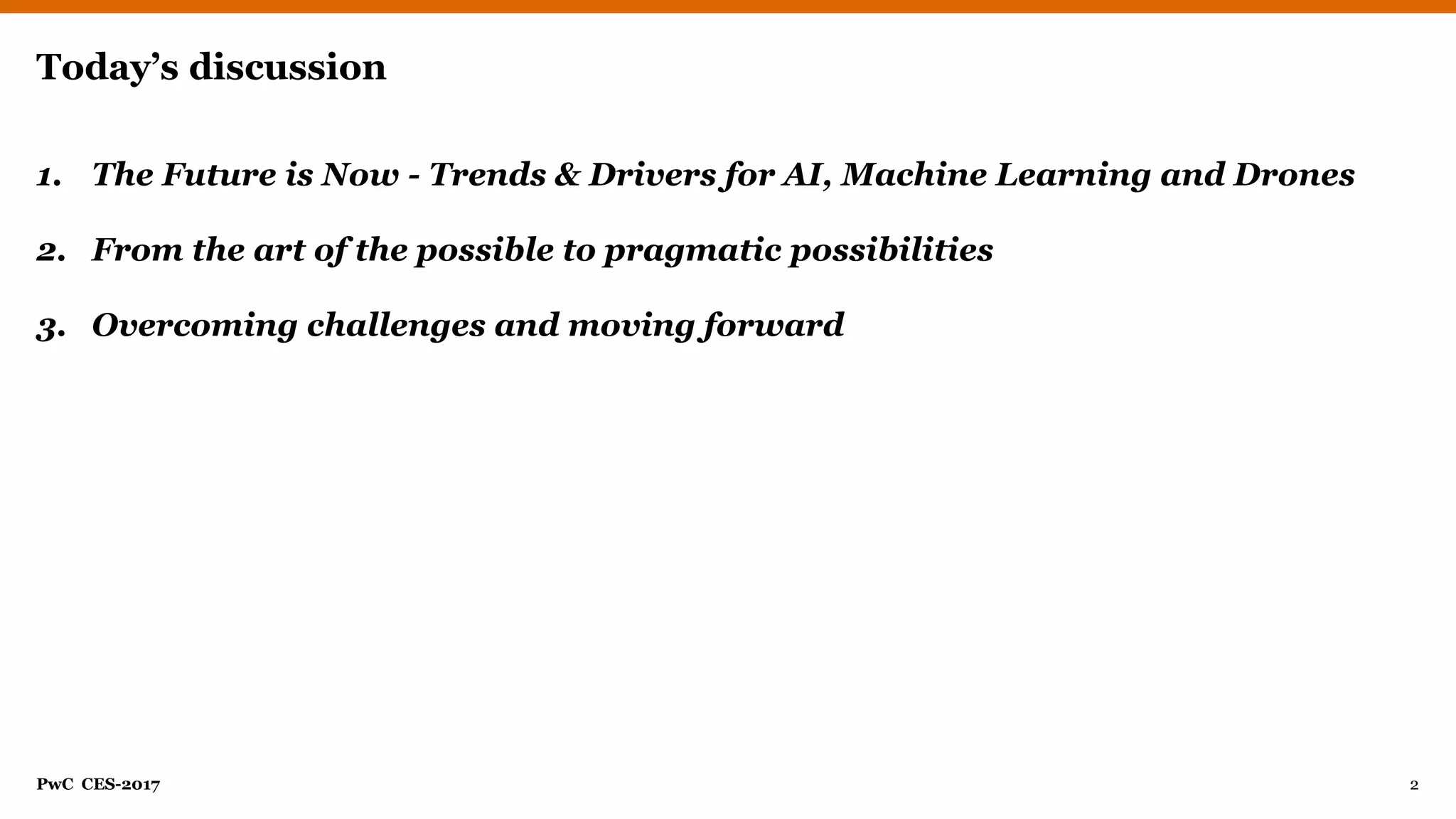 This document discusses emerging technologies like artificial intelligence (AI), machine learning, and drones. It contains three main sections: 1) trends driving AI, machine learning, and drones, 2) examples of applying these technologies pragmatically, and 3) overcoming challenges to move forward. PwC examples show AI and drones used for construction site analysis, smart cooler insights, cancer research, mobility strategies, call center transcription, financial advice, and oil/gas contract extraction. The document emphasizes demonstrating value through pilots, addressing data challenges, and blending intuition with data insights.