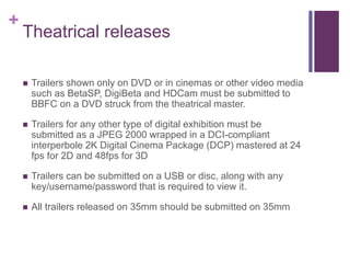 The document outlines industry regulations for theatrical releases and technical requirements for film classification in the UK. Trailers must be submitted on DVD, DCP, or 35mm film depending on the type of exhibition. All work submitted should be the final edit with sound and moving footage classified, though distributors can exempt some footage. Credentials are required for films rated 15 or 18.