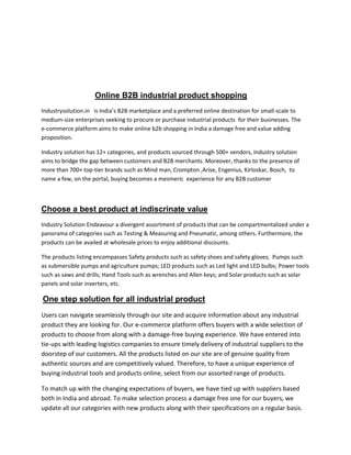 Industry Solution is an Indian B2B marketplace that aims to make online shopping for industrial products easy and cost-effective for small and medium enterprises. It offers over 12 categories of products from over 500 vendors and 700 brands. Products include safety equipment, pumps, tools, LED products, and solar equipment. The marketplace works to ensure timely delivery and competitive pricing, and strives to be a one-stop solution for all industrial procurement needs through its wide selection and smooth online purchasing process.