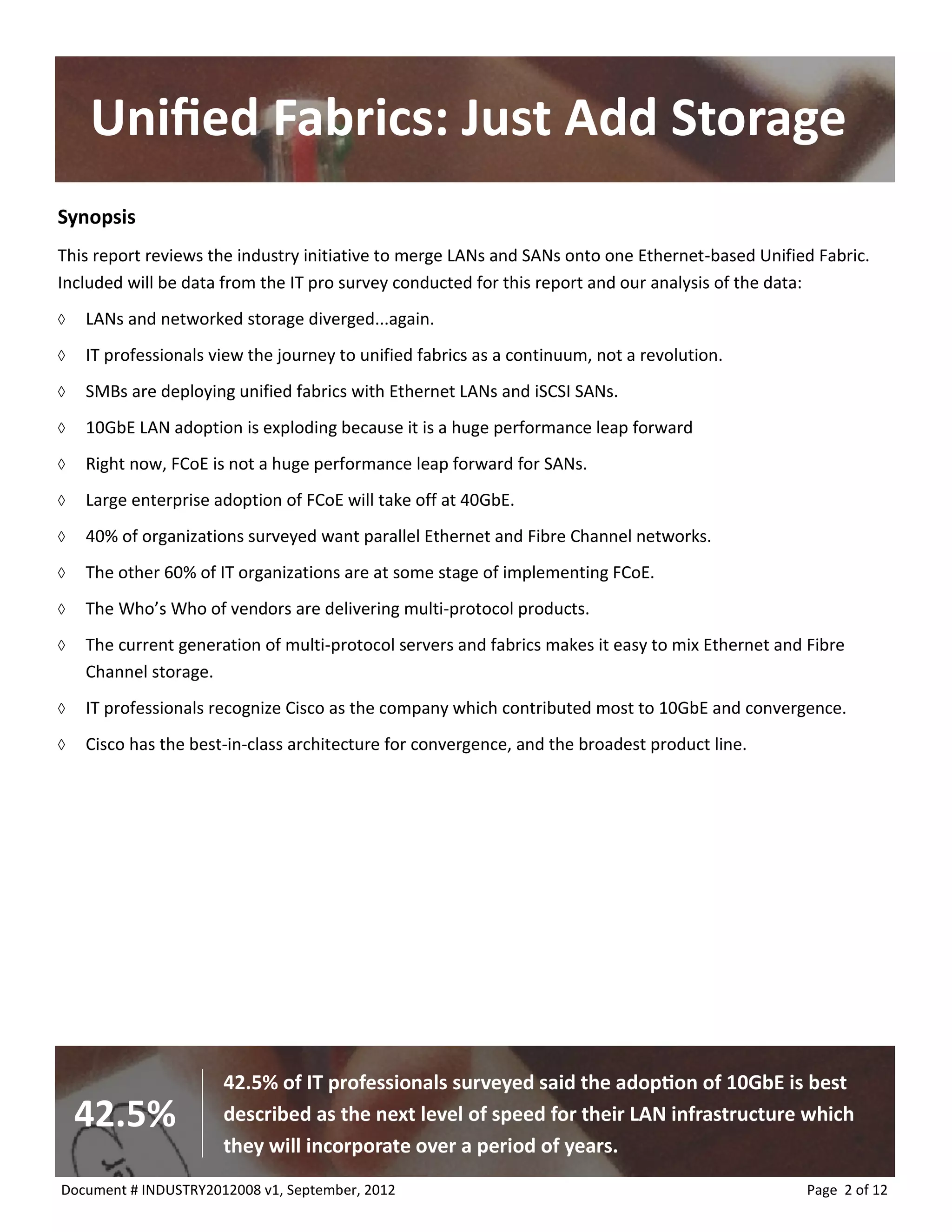 The document discusses the initiative to merge LANs and SANs into a unified Ethernet-based fabric, highlighting trends in technology adoption among IT professionals. Key findings reveal a significant shift toward 10GbE implementations, driven by server virtualization, and a growing acceptance of Fibre Channel over Ethernet (FCoE) as standards evolve. Cisco is recognized as a leading contributor to this convergence, supported by a range of advanced networking products that facilitate the transition to a unified fabric architecture.