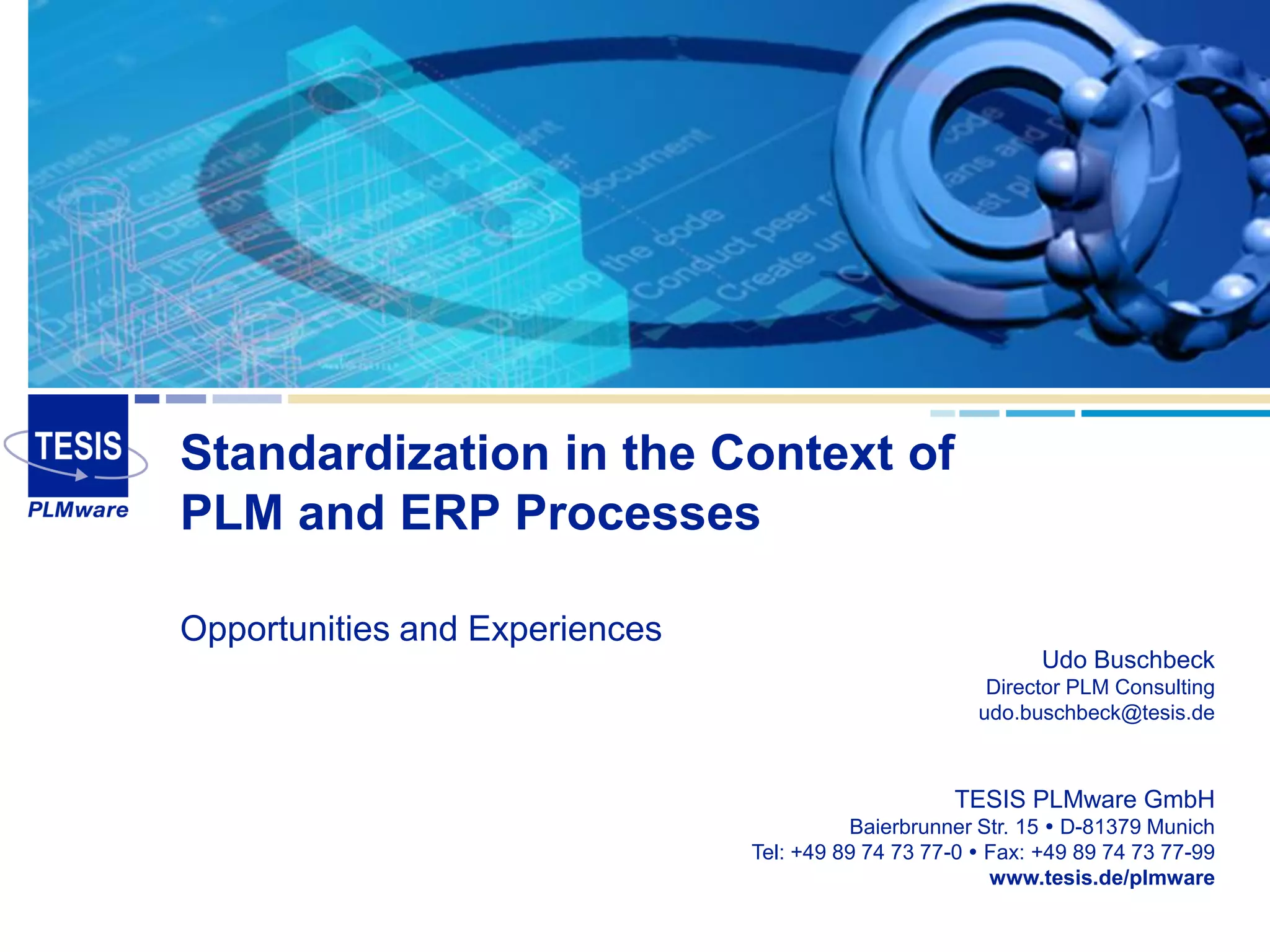 The document discusses the role of standardization in PLM (Product Lifecycle Management) and ERP (Enterprise Resource Planning) processes, emphasizing optimization and integration of product development and business processes. It outlines the evolution of PLM environments, tools involved, and various sample processes, highlighting the importance of seamless integration and effective information exchange. Additionally, it presents the approach for projects aimed at enhancing efficiency and emphasizes the significance of training and collaboration among interdisciplinary teams.