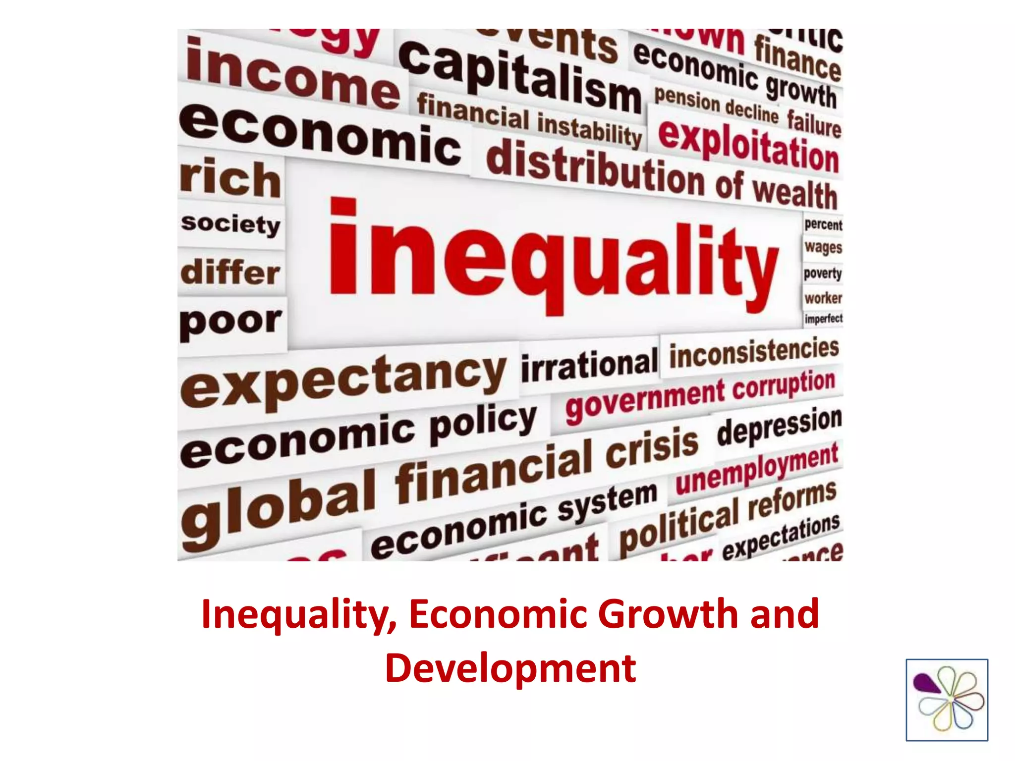 The document discusses inequality, economic growth, and development. It covers several topics: Kuznets and income inequality; real income growth in the USA and top income shares; a global perspective on inequality between 1988-2008 showing rising incomes for the middle class in China and India. It also discusses the root causes of inequality like less progressive tax systems and market failures in education and housing. Strategies to reduce inequality include investing in education, pursuing inclusive pro-poor growth policies, and microfinance. Overall, the document examines inequality from various economic perspectives and proposes approaches to promote shared prosperity across populations.
