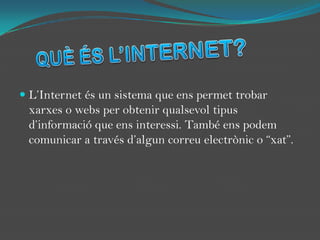 QUÈ ÉS L’INTERNET?L’Internetés un sistema que ens permet trobar xarxes o webs per obtenir qualsevol tipus d’informació que ens interessi. També ens podem comunicar a través d’algun correu electrònic o “xat”.