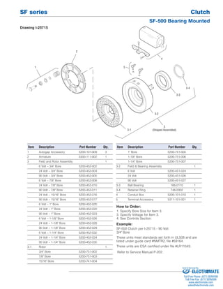 This document provides specifications for an SF-500 bearing mounted clutch, including dimensions, torque ratings, voltage options, and part numbers for ordering. Key specifications include: