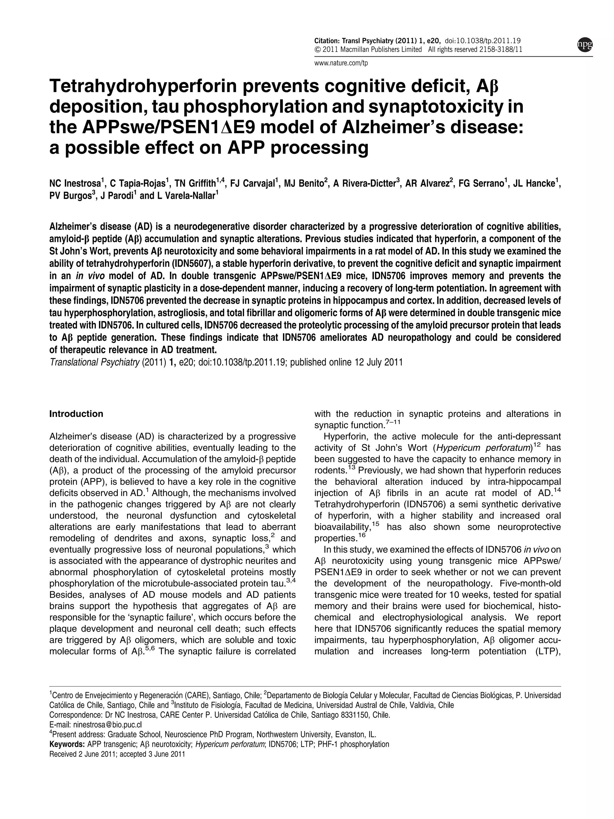Tetrahydrohyperforin (IDN5706), a derivative of the active molecule hyperforin in St. John's Wort, was examined for its ability to prevent cognitive deficits and synaptic impairment in an Alzheimer's disease mouse model. Five-month old APPswe/PSEN1DE9 mice were treated with IDN5706 for 10 weeks. IDN5706 improved memory, prevented decreases in synaptic proteins and LTP, and reduced amyloid-beta plaque burden, tau hyperphosphorylation, and astrogliosis. In cell cultures, IDN5706 decreased amyloid precursor protein processing leading to amyloid-beta peptide generation. The results suggest IDN5706 may be a potential therapeutic for treating Alzheimer's