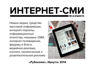 Документ обсуждает особенности иркутских интернет-СМИ, выделяя как их преимущества, так и недостатки, такие как недостаточная адаптация к специфике подачи материала и низкая активность в социальных сетях. Упоминаются критерии для определения интернет-СМИ, включая форматы веб-сайтов телекомпаний, печатных изданий и информационных агентств. Также рассматриваются аспекты рекламы в интернет-СМИ и важность контента, обновлений и оригинальности материалов.