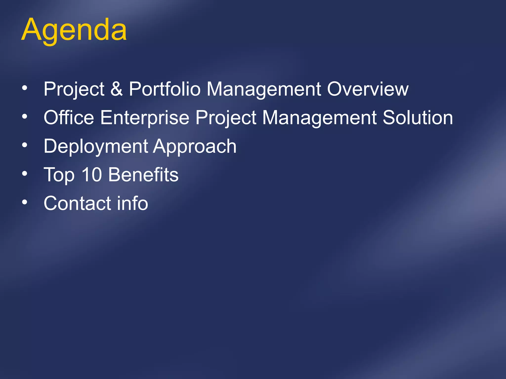 This document summarizes an enterprise project management solution that provides portfolio management, project management, and resource management capabilities. It discusses deployment approaches, best practices, and the top 10 benefits of the solution. These include standardizing governance processes, prioritizing investments, aligning portfolios with strategy, managing resources effectively, collaborating easily, measuring performance, and realizing quick ROI.