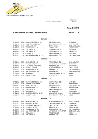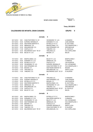 This document contains the schedule for the 2012/2013 season of the Infantil Gran Canaria youth soccer group 9. It lists the dates, times, and locations of 12 rounds of matches between the 14 participating clubs. Each round consists of 7 simultaneous games played at various locations across Gran Canaria.