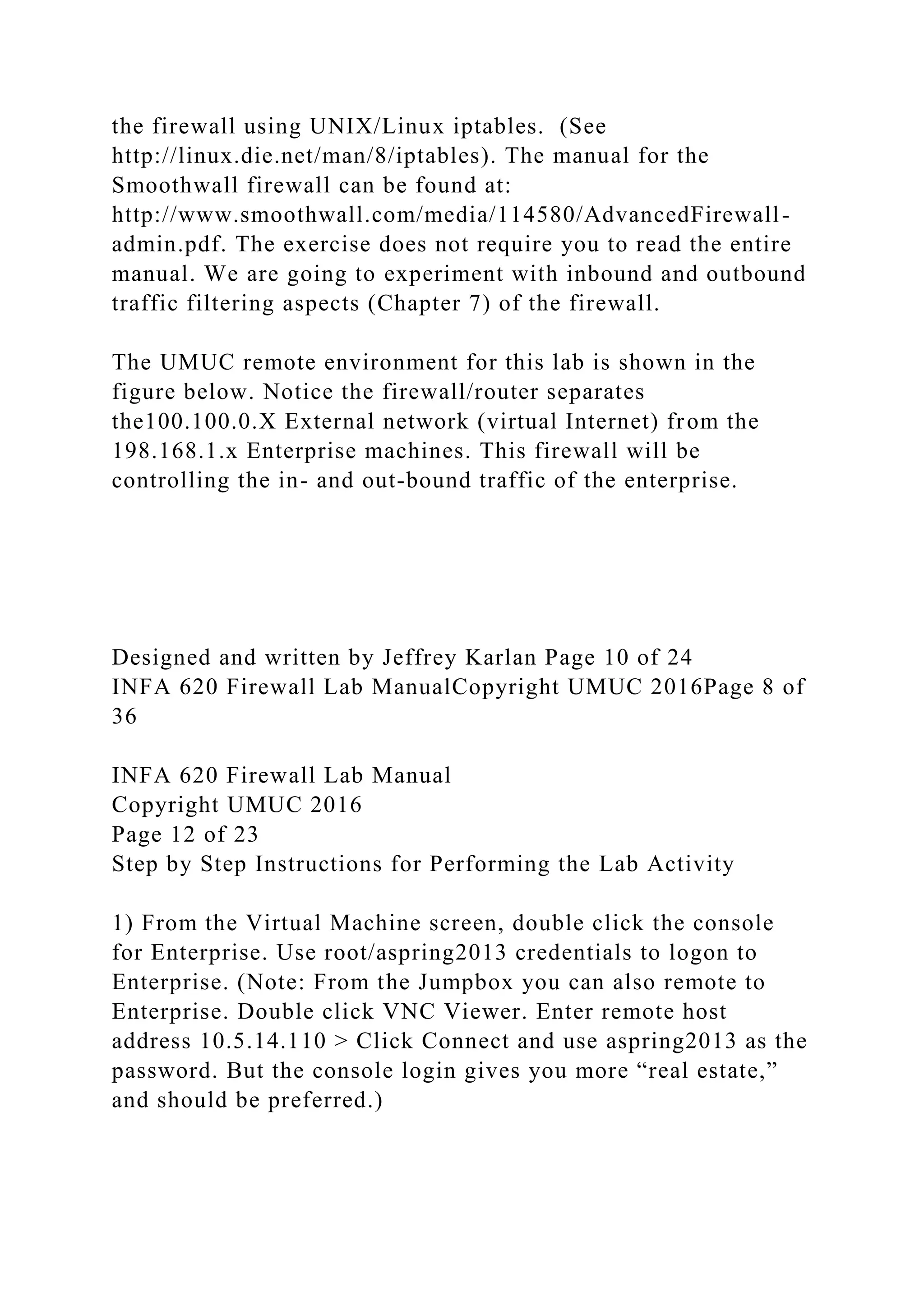 This document outlines a lab exercise for configuring a Smoothwall firewall to manage network traffic between an enterprise network and an external network. It details the steps to set up the firewall, manage inbound and outbound traffic, and create rules for allowing specific protocols. The lab emphasizes best practices for firewall administration, such as maintaining a whitelist for security.