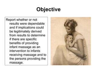 This critical review evaluates the benefits of infant massage for both infants and their parents or caregivers, addressing its potential in alleviating issues stemming from adverse childhood experiences. The review analyzes peer-reviewed studies to ascertain whether infant massage serves as an effective intervention, with findings suggesting positive outcomes such as decreased crying and improved caregiver interactions. Limitations in the studies, including sample size and design, indicate the need for further research to substantiate these findings.