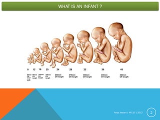 The document discusses infant speech perception and development. It notes that infants begin learning their native language before birth through exposure to their mother's voice and languages. After birth, infants show a preference for their mother's voice and familiar sounds heard prenatally. The document then outlines four stages of speech development from 0-3 months to 9-12 months, describing typical vocalizations and skills at each stage such as cooing, babbling, and first words. Finally, it briefly mentions common speech disorders.
