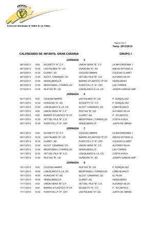 This document contains a calendar listing match dates and opponents for an infant soccer league in Gran Canaria, Spain. It includes 15 rounds of matches taking place from September 2013 to January 2014 involving teams such as Acodetti, Las Palmas, Heidelberg, Medifonsa Torres, and others. The calendar provides information on date, time, location and participating teams for each match.