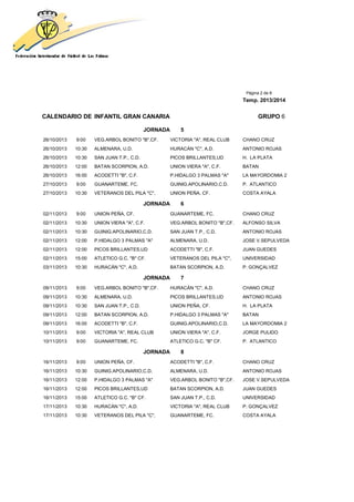 This document contains a calendar for an infant soccer league in Gran Canaria, Spain. It lists the dates, times, and participating teams for 15 rounds of matches in the 2013-2014 season for Group 6. Each round lists multiple matches being played on different dates and times. The calendar provides all the scheduling information for this infant soccer league over the course of the season.