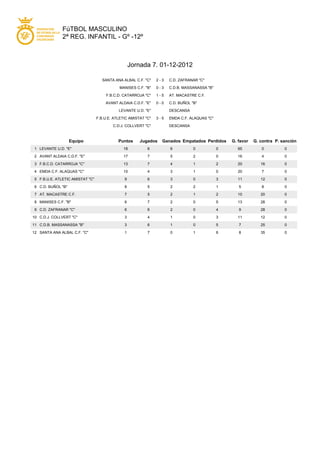 This document summarizes the results of the 7th matchday of the 2nd regional boys' football league for ages 12 and under. It lists the scores of 6 matches played, as well as the current league standings showing each team's points, games played, won, drawn, lost, goals for, goals against, and penalty points. Levante UD E is currently in first place with 18 points from 6 games.