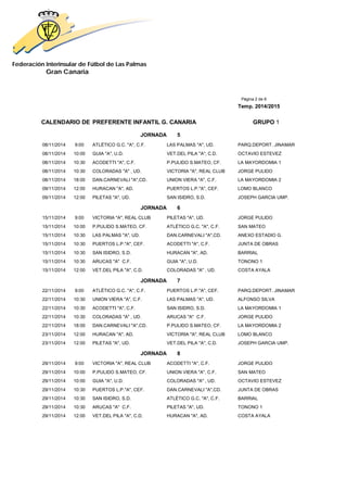 The document is a calendar for a youth football league in Las Palmas, Gran Canaria. It lists the dates, times, and participating teams for 14 rounds of matches in the league. Each round lists multiple matches being played simultaneously on the same day at different locations.