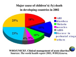 1. Diarrhea is a common disease in childhood that can be caused by infections, non-infectious factors, or a combination of both. Infectious causes include viruses like rotavirus and bacteria like E. coli, while non-infectious causes include improper diet, weather factors, and feeding issues.