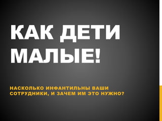 Документ анализирует инфантильность сотрудников и её причины, включая исторические и культурные факторы, такие как влияние СССР на личностное развитие. Он подчеркивает негативные последствия инфантильного поведения для индивидуумов, семей и организаций, включая низкую эффективность и зависимость. В качестве решения предлагается психологический подход к 'взрослению', включающий работу с субличностями и обсуждение путей повышения взрослости в коллективе.