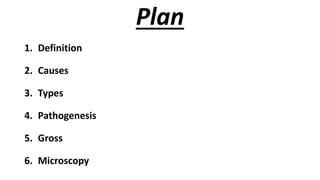 This document discusses infarcts, which are areas of ischemic necrosis caused by occlusion of the arterial supply or venous drainage. It defines infarcts and lists common causes like thrombotic occlusion. It describes different types of infarcts based on color, age, and presence of infection. Pathogenesis involves local hyperemia, edema, hemorrhage, and cellular changes leading to necrosis replaced by fibrous tissue. Gross morphology shows wedge-shaped areas pointing toward the occluded vessel. Microscopy shows coagulative necrosis and inflammatory reaction at the periphery replaced by fibrous tissue. Commonly affected organs and outcomes are also outlined.