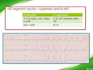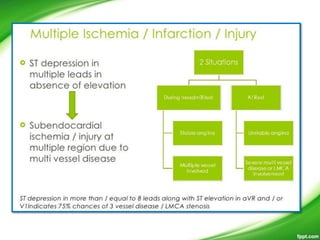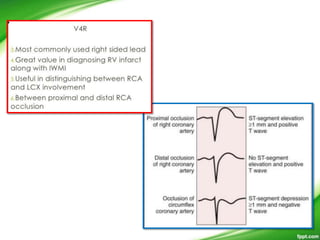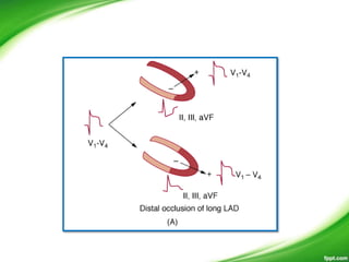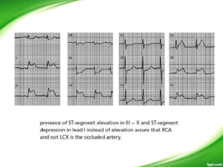 This document discusses ECG patterns in ST-elevation acute coronary syndrome (ACS). It provides threshold values for defining ST elevation and discusses patterns corresponding to different infarct locations. Anterior STEMI results from LAD occlusion and involves the interventricular septum. Inferior STEMI is usually due to RCA occlusion but can also be from dominant LCx occlusion. Wellens' syndrome indicates high-grade LAD stenosis. Posterior MI accompanies inferior or lateral MI and implies a larger infarct size. The document also provides algorithms to localize the infarct artery based on ECG patterns.