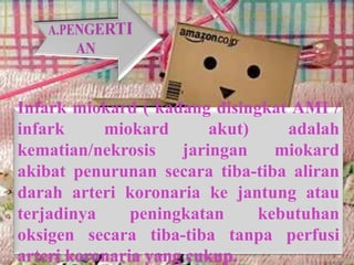 AMI atau infark miokard akut terjadi ketika iskemia berlangsung lebih dari 30-45 menit, menyebabkan kerusakan seluler permanen pada bagian jantung yang terkena. Gejala infark miokard meliputi nyeri dada, sesak nafas, dan gangguan pencernaan. Penanganannya meliputi pemberian oksigen, pemantauan EKG, istirahat, obat-obatan trombolitik, beta blocker, ACE inhibitor, antikoagulan, antiplatelet, dan j