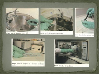 The document discusses infection control and sterilization in dentistry. It outlines the objectives of infection control as removing or destroying microorganisms to prevent contamination and infection. It describes universal precautions for treating all patients as potentially infectious and discusses personal protective equipment like gloves, masks, and protective eyewear to act as barriers against transmission of infection. It also covers sterilization methods for destroying all microorganisms, as well as disinfection for reducing pathogenic microorganisms.