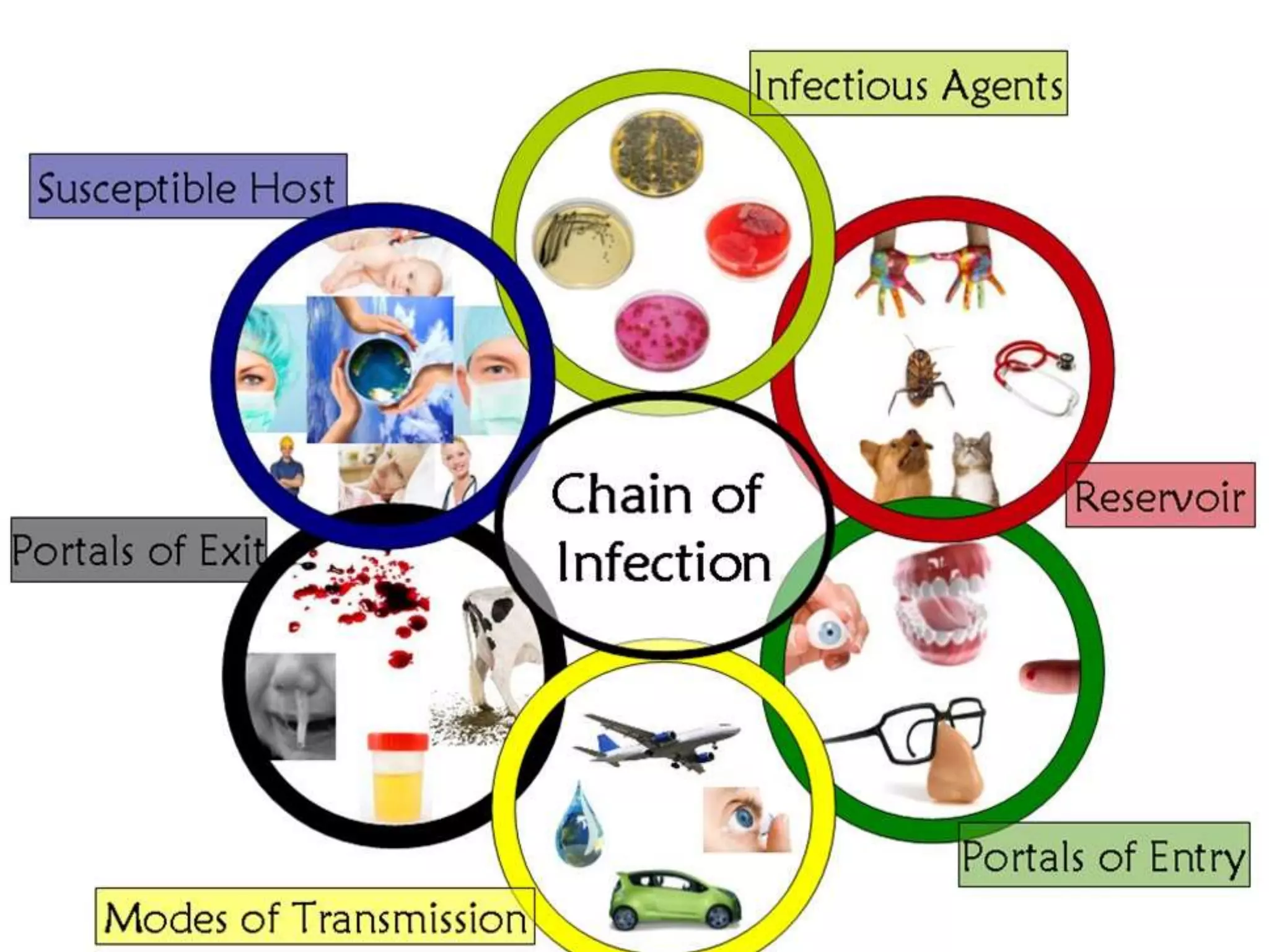 An infection occurs when pathogens invade the body and reproduce, potentially causing disease. Microorganisms are transmitted through body fluids, direct contact, droplets, and contaminated surfaces. Portals of entry include mucous membranes and breaks in the skin. Hospitals present increased infection risks due to patients' health issues, invasive procedures, and virulent pathogen strains. Standard precautions like hand washing, personal protective equipment, sharp handling protocols, and waste management can reduce transmission when applied consistently. Staff education also helps prevent the spread of infections.