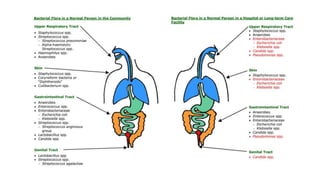 This document discusses infection control concepts, including the cycle of infection and how microorganisms like bacteria, viruses, fungi and protozoa can be transmitted. It explains that hospitals are sites for disease transmission due to gathering sick patients. Proper infection control practices like following established policies are important for healthcare worker and patient safety. Microorganisms can be transmitted through direct or indirect contact via fomites, vectors, vehicles, droplets or airborne routes. The body has natural and acquired defenses against infections that can be supported by vaccines and immunoglobulins.