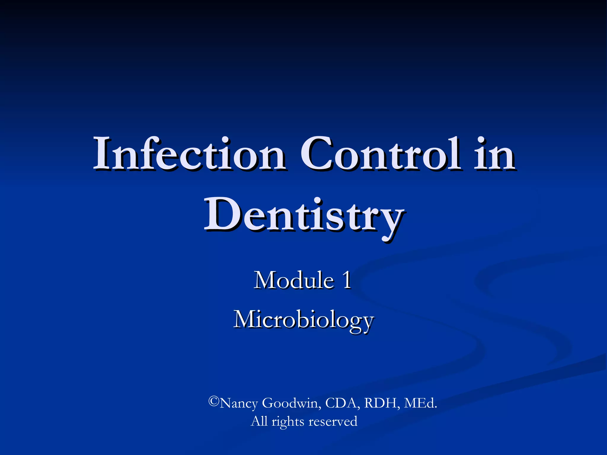 This document provides an overview of microbiology concepts relevant to infection control in dentistry. It defines different types of microorganisms like bacteria, viruses, fungi and explains how they can be transmitted. It discusses the chain of infection and how breaking the chain can prevent cross-contamination. It also outlines the roles of organizations like CDC, OSHA and OSAP in establishing infection control guidelines and standards.