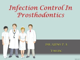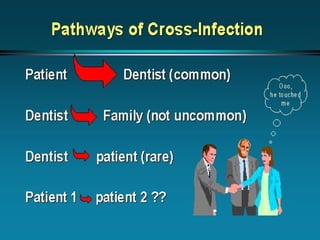 This document discusses infection control in dentistry. It covers the chain of infection, modes of disease transmission including cross-contamination and droplets, definitions of key terms like sterilization and disinfection, and the objectives and principles of infection control. Personal protective equipment is described including masks, gloves, protective eyewear and head caps. Proper sterilization, disinfection and waste disposal are emphasized to break the chain of infection and protect dental professionals and patients.