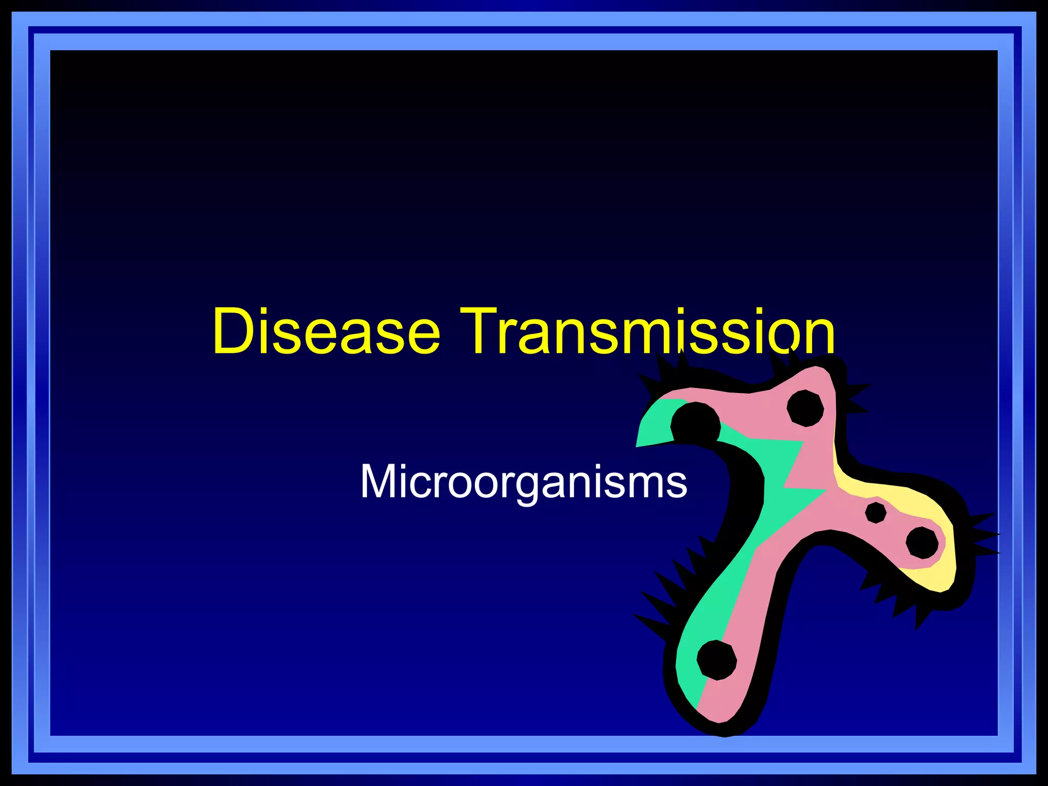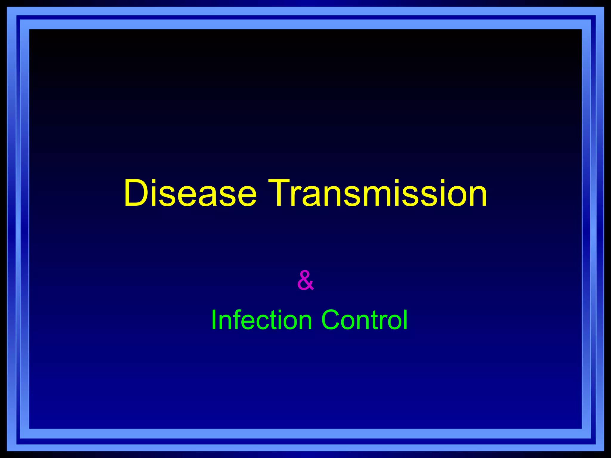 This document discusses disease transmission and infection control. It covers the following key points:
