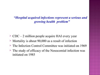 This document discusses hospital acquired infections (HAIs), also known as nosocomial infections. Some key points: