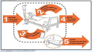 The document discusses infection control and prevention. It defines key terms like infection, explains the chain of infection using the six link model, and identifies patients at risk. It also describes the difference between medical and surgical asepsis. Proper hand hygiene and standard precautions are emphasized as the primary strategies for reducing transmission of infections. Key learning objectives are explained such as the relationship between the infection chain and transmission, identifying at-risk patients, and performing proper hand hygiene and use of gloves.