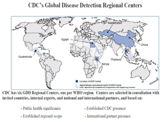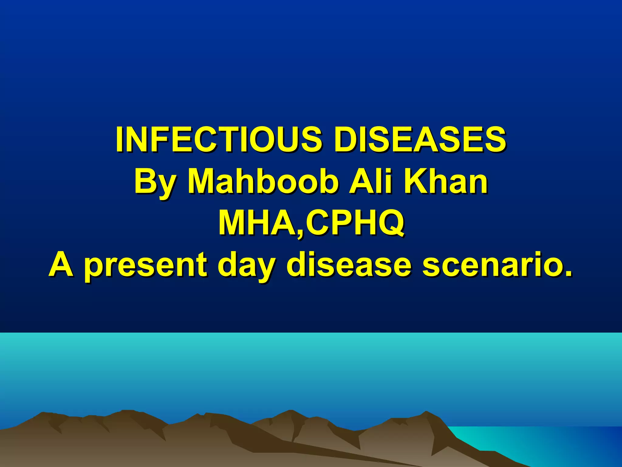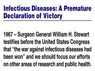 The document discusses the historical and ongoing impact of infectious diseases, with a focus on the West Nile virus outbreak in the U.S. and various factors contributing to the emergence and re-emergence of infectious diseases. It highlights the importance of surveillance, prevention strategies, and the role of public health professionals in managing infectious disease threats. Key challenges include resistance to treatment, climatic changes, and the socio-economic factors affecting disease spread and control.