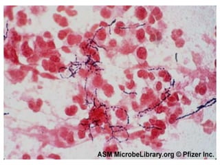 Staphylococcus aureus and Streptococcus pyogenes are common Gram-positive bacterial infections that cause issues like skin lesions, pneumonia, and rheumatic fever. They produce toxins and adhere to host cells to cause illness. Gram-negative bacteria like Neisseria meningitidis, Bordetella pertussis, and Pseudomonas aeruginosa can lead to meningitis, whooping cough, and pneumonia through virulence factors and invasion of tissues. Yersinia pestis caused the bubonic plague through proliferation in lymph nodes and necrosis of tissues.