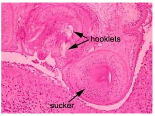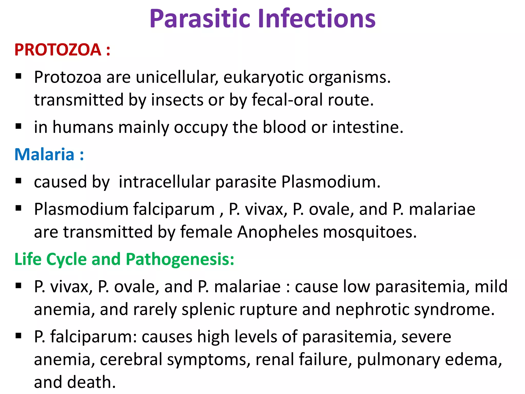 This document discusses various parasitic infections caused by protozoa and metazoa. It describes the life cycles and pathologies of malaria, caused by Plasmodium parasites transmitted by mosquitoes; leishmaniasis, caused by Leishmania parasites transmitted by sandflies; tapeworm infections such as cysticercosis caused by Taenia solium larvae; hydatid disease caused by Echinococcus granulosus; schistosomiasis caused by blood flukes of the genus Schistosoma transmitted by snails; and lymphatic filariasis caused by Wuchereria bancrofti transmitted by mosquitoes. For each parasite, it details the clinical manifestations, histopathology, and