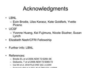 The document discusses the use of phylochip technology to characterize microbial communities in relation to human health and disease, focusing on its application in cystic fibrosis research. Despite identifying a significant number of operational taxonomic units (OTUs), the study found that only a few were strongly associated with known pathogens at varying ages. The phylochip method is compared to other sequencing methods, highlighting its efficacy in detecting community structures while noting the challenges associated with rare taxa and practical sampling considerations.