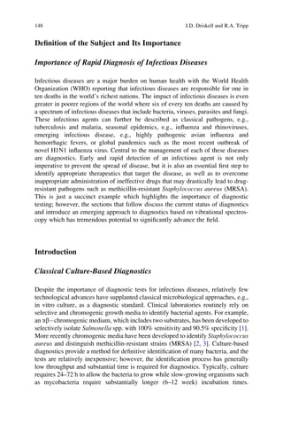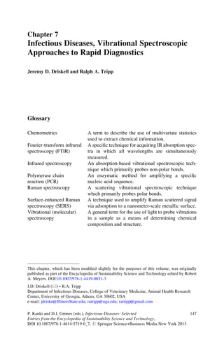 This document discusses the importance of rapid diagnosis of infectious diseases and summarizes current diagnostic methods and their limitations. Classical culture-based diagnostics are time-consuming and cannot identify all pathogens. Antibody-based diagnostics like ELISA and lateral flow tests are faster but have limitations in sensitivity and specificity due to their reliance on pathogen-specific reagents. Molecular diagnostics like PCR are highly sensitive and specific but require specialized equipment and skilled technicians, limiting their use outside centralized laboratories. Vibrational spectroscopic approaches that generate biochemical fingerprints of whole pathogens offer a promising alternative as they can provide rapid, reagent-free identification of infectious agents.
