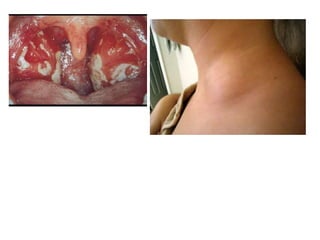 This document discusses Epstein-Barr virus (EBV) infectious mononucleosis. It defines EBV and describes the typical clinical presentation of fever, pharyngitis, lymphadenopathy, and fatigue. Complications are outlined as neurological, hematological, splenic rupture, respiratory, or hepatic issues. Risk factors include people ages 15-30 and those with frequent social contact. Diagnosis involves history, exam findings, and lab tests like mono spot testing and antibody levels. Treatment is generally supportive with rest, hydration, and pain medications while monitoring for complications.
