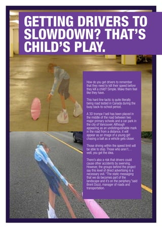 1) A 3D optical illusion of a girl chasing a ball has been placed in the road near schools in Vancouver to get drivers to slow down by appearing as if they have hit the girl.