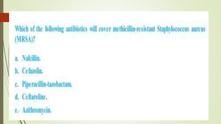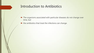 This document discusses infectious diseases and treatment of various bacterial infections. It begins with an introduction to antibiotics and how the bacteria that cause disease remain the same but the antibiotics used to treat them can change. It then discusses treatment of methicillin-sensitive and methicillin-resistant Staphylococcus aureus infections. The remainder of the document covers various classes of antibiotics including penicillins, cephalosporins, carbapenems, fluoroquinolones, aminoglycosides and others; the bacteria and infections they treat; and treatments for central nervous system infections like meningitis and encephalitis.