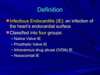 1. Infective endocarditis is an infection of the heart valves or endocardium. It can affect native or prosthetic valves.