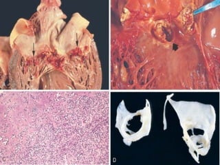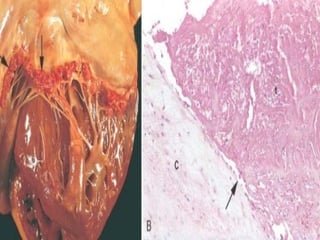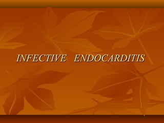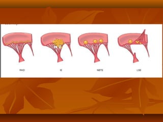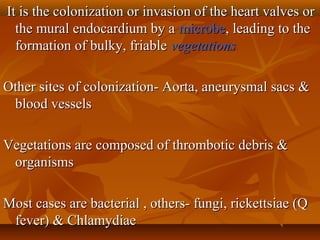 This document describes infective endocarditis, which is the colonization or invasion of heart valves or inner lining of the heart by microbes, leading to the formation of bulky vegetations. It discusses the different types (acute vs subacute), predisposing factors, common causative organisms, pathology, clinical features, diagnosis using the Duke criteria, and noninfected vegetations such as those seen in marantic endocarditis and systemic lupus erythematosus.