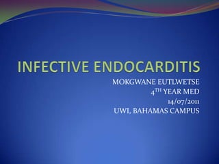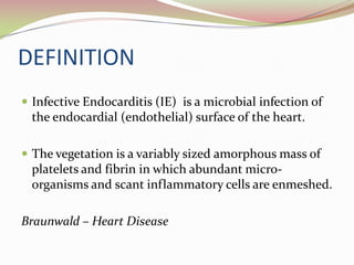 Infective endocarditis is a microbial infection of the heart valves or endocardium. It is caused by bacteria, usually streptococci or staphylococci, entering the bloodstream and colonizing injured heart valves or endothelium. Predisposing conditions include rheumatic heart disease, congenital heart disease, prosthetic heart valves, and intravenous drug use. Symptoms include fever, chills, sweats, and heart murmur. Diagnosis involves blood cultures, echocardiography, and clinical criteria. Treatment consists of intravenous antibiotics for 4-6 weeks along with surgery if needed to repair or replace damaged valves. Prophylactic antibiotics are recommended for high risk patients before certain medical procedures to prevent