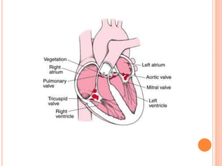 - Diagnosis is based on modified Duke criteria using clinical findings, blood cultures, and echocardiography findings. Treatment involves prolonged antibiotic therapy and may require surgery to remove infected tissues.