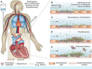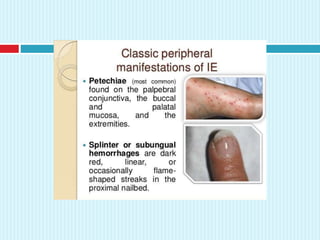 This document discusses infective endocarditis, including its risk factors, classification, typical causative organisms, pathogenesis, clinical manifestations, diagnosis, and treatment. Some key points: