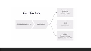 2. TensorFlow Lite which converts TensorFlow models into an efficient format for mobile and embedded devices and provides optimizations like quantization, pruning, and model topology transforms to reduce latency, memory usage, and improve power efficiency.