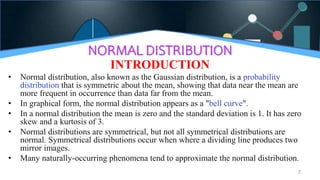 2. The normal distribution is a bell-shaped curve that is symmetric around the mean. It is defined by its mean and standard deviation. The z-distribution is the standard normal distribution where the mean is 0 and standard deviation is 1.